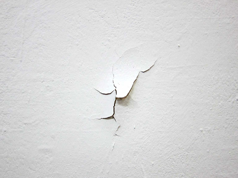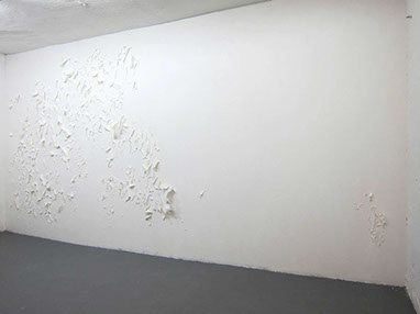 Ici c’est l’espace d’exposition qui se dévoile, qui se montre comme étant son propre sujet. La peinture se décolle et se craquelle grâce à un procédé chimique par lequel le mur s’espace de lui-même, créant des motifs natifs de ses propres faiblesses.