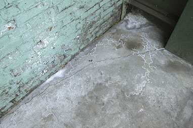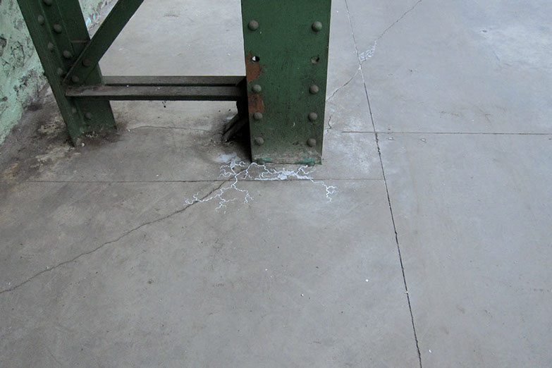Le salpêtre se trouve dans les endroits pollués par les nitrates comme ici dans cette ancienne usine métallurgique. Ces dessins in situ font sortir des angles et des fissures le salpêtre déjà présent, étendant son territoire autour des tâches d’humidité et des amas de poussière.